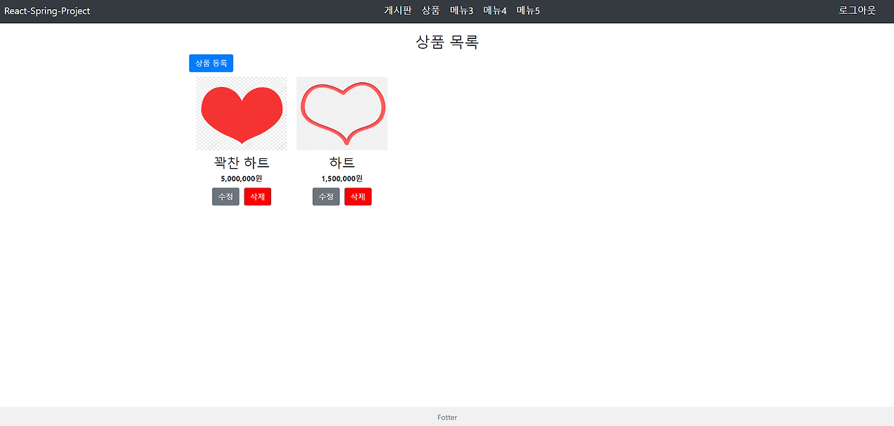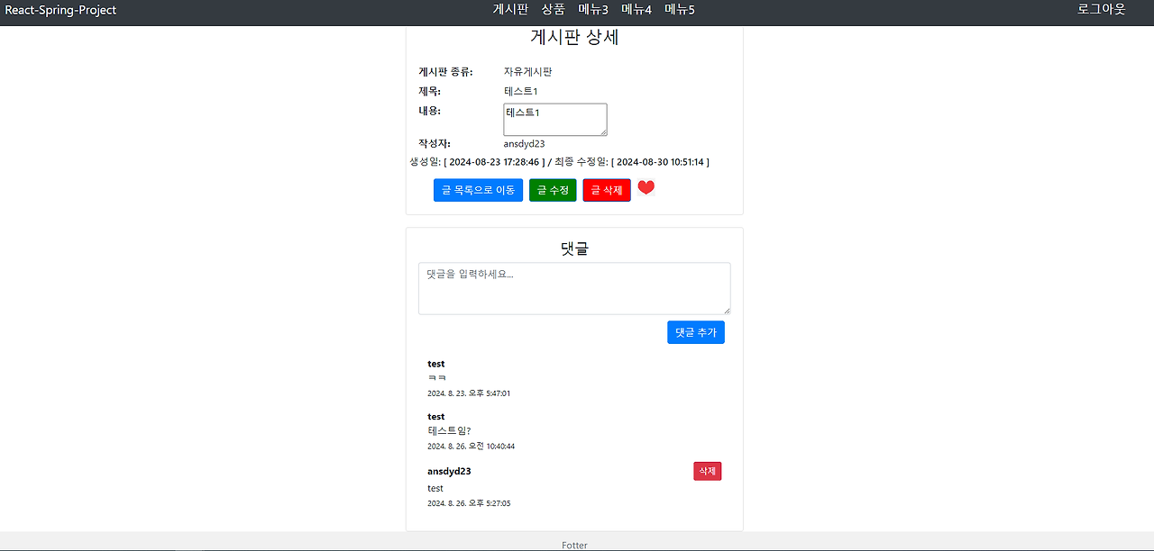 5개의 메뉴를 구성(현재는 게시판과, 상품만 구성) 게시판에는 댓글과 좋아요 기능이 달렸으며 아이디를 인식하여 수정 및 삭제 접근이 허용된다, 상품 등록은 이미지 업로드 기능이 들어가 있다.